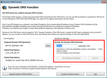 You can change the assigned DDNS name of the VPN Gate Service computer. The default DDNS name is "vpn**********.opengw.net" . You can change the DDNS hostname. To change it, click the "Dynamic DNS Setting" button and follow the screen instructions.